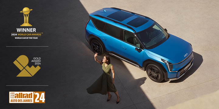 100 Auto-Journalisten aus 29 Ländern wählten den Kia EV9 zum besten Auto des Jahres. (Sparte "Elektro" und insgesamt.) Sie lobten das innovative Design, geräumige Interieur und wettbewerbsfähige Preisniveau.